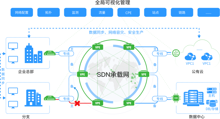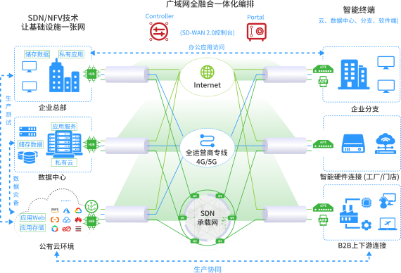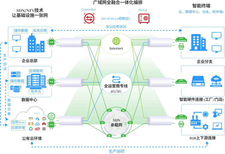 支持云网络,数据中心网,办公网的统一编排管理,让复杂交错的广域网从此简化管理。