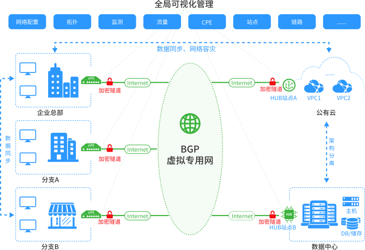 支持云网络,数据中心网,办公网的统一编排管理,让复杂交错的广域网从此简化管理。